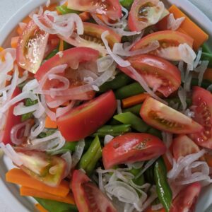 6 Porciones INGREDIENTES 1 zanahoria cortada un bastones1/2 media cebolla cabezona en aros200 gr de habichuela en julianas3 tomates en cascos1/3 taza de aceite de oliva1 cucharadita de sal1 cucharadita de pimienta1/3 taza de agua Alista todos los vegetales en…